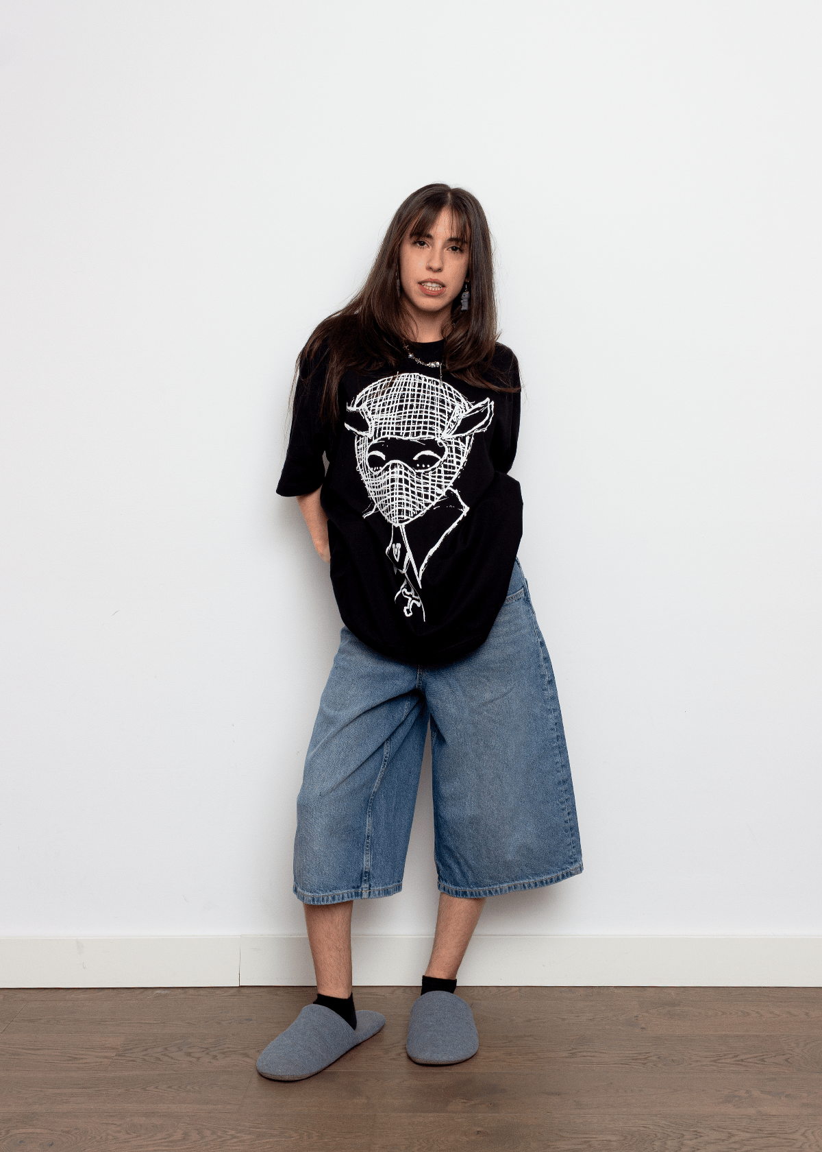Aiden mide 157 cm y usa la Talla M.
